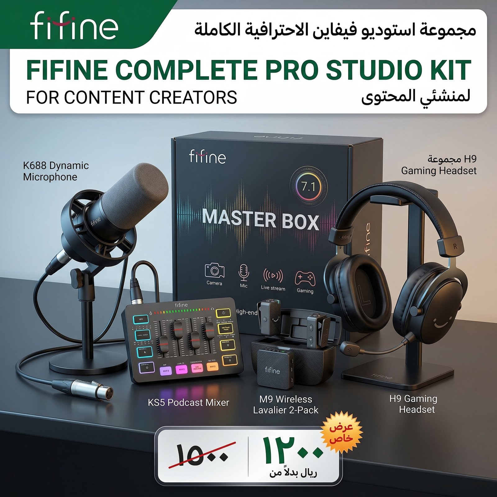 الحل الشامل والنهائي لكل صانع محتوى أو “جيمر” يبحث عن جودة صوت استثنائية. تضم الباقة ميكروفون K688 Dynamic للأداء الصوتي النقي، ميكسر KS5 Podcast للتحكم الكامل، سماعة الرأس المحيطية H9، بالإضافة إلى نظام الميكروفون اللاسلكي M9. كل ما تحتاجه للبث المباشر، تسجيل البودكاست، والألعاب في حزمة واحدة وبسعر تنافسي.