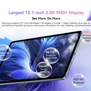 تابلت Blackview MEGA 3 مقاس 12.1 بوصة 2.5K 90 هرتز، شاشة 12 جيجابايت 256 جيجابايت 8800 مللي أمبير في الساعة 50 ميجابكسل، كاميرا 33 وات شحن سريع Widevine L1 Android 15 Pad PC