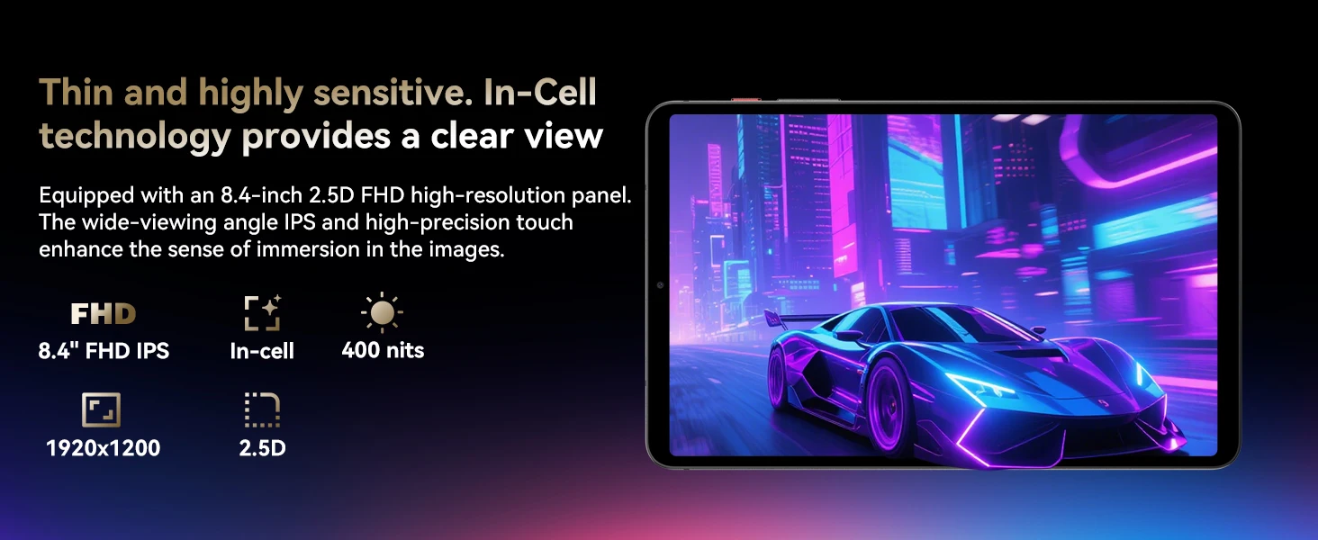 استمتع بصور نابضة بالحياة وواضحة على شاشة FHD IPS مقاس 8.4 بوصة، مما يجعلها مثالية لمشاهدة الأفلام أو تصفح الويب.