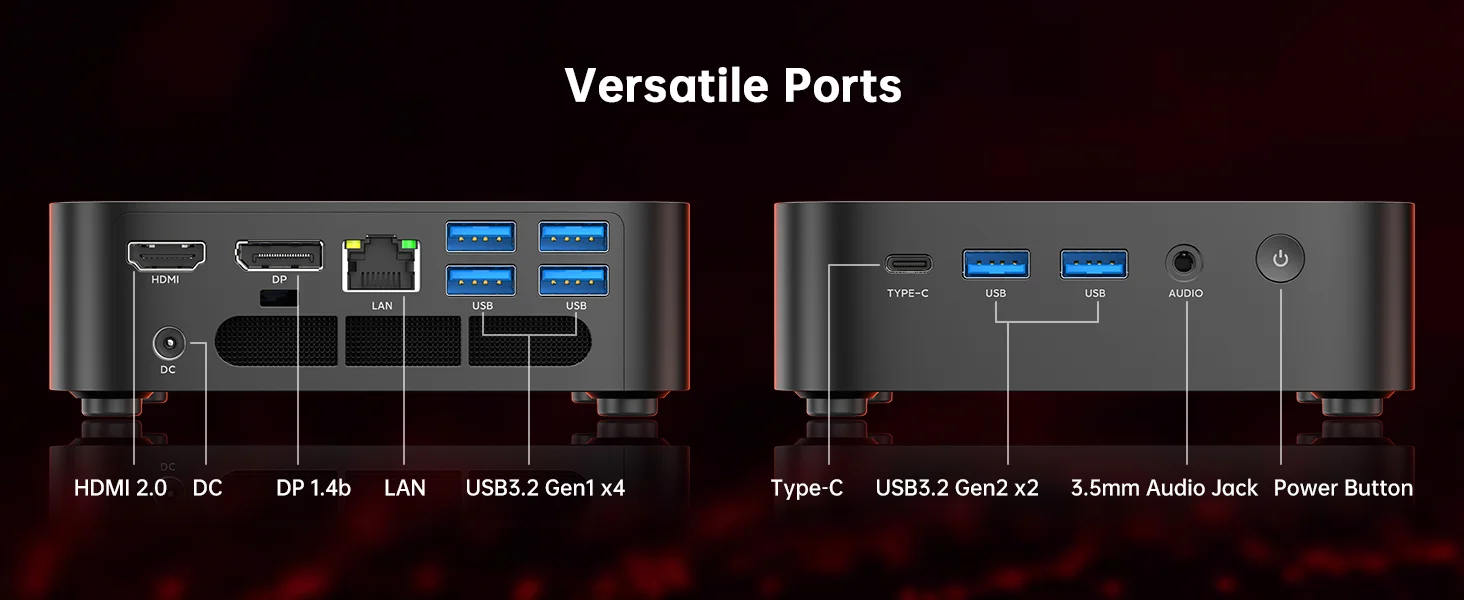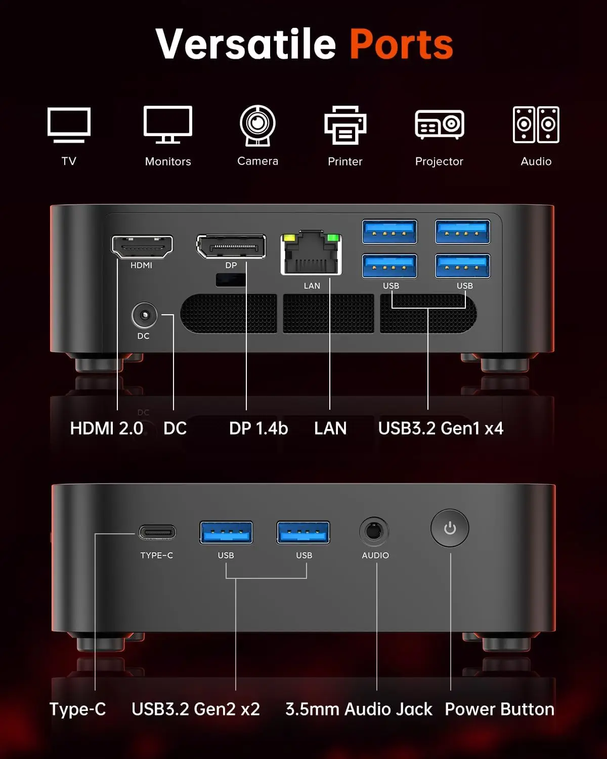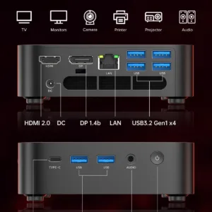 ٥. النظام المثبت مسبقًايأتي مع نظام Windows 11 Pro المثبت مسبقًا، جاهز للاستخدام فور إخراجه من العلبة. 【ايه ام دي رايزن 5 7430U】الحاسوب المصغر مزود بمعالج AMD Ryzen 5 7430U (6 نوى/12 خيط معالجة، ذاكرة تخزين مؤقت 16 ميجابايت، يصل إلى 4.3 جيجاهرتز).إنه قادر على التعامل مع المهام الحسابية الثقيلة بسلاسة وتقديم أداء استثنائي. 【ذاكرة DDR4 سعة 16 جيجابايت ومحرك أقراص SSD سعة 512 جيجابايت】يأتي الكمبيوتر الصغير بذاكرة وصول عشوائي DDR4 بسعة 16 جيجابايت وقرص SSD من نوع M.2 NVMe بسعة 512 جيجابايت (قابل للترقية حتى 2 تيرابايت)، مما يتيح معالجة الأوامر بشكل أسرع.يدعم هذا الكمبيوتر الصغير المخصص للألعاب قدرات تحميل ومعالجة قوية، مما يوفر تجربة أكثر سلاسة. 【منافذ وفيرة】 يوفر مجموعة متنوعة من المنافذ، بما في ذلك منفذ HDMI واحد، ومنفذ Type-C واحد، ومنفذ DP واحد، ومنفذ RJ45 بسرعة 1G واحد، و3 منافذ USB 3.2 Gen2، و4 منافذ USB 3.2 Gen1، ومنفذ واحد لإدخال/إخراج الصوت، مما يلبي بسهولة احتياجات العمل والترفيه المنزلي.