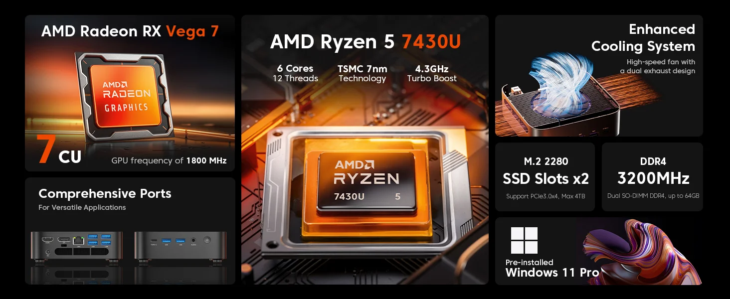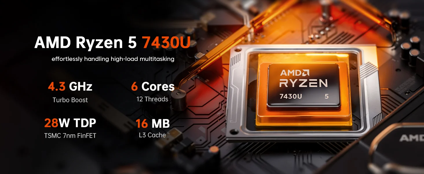 • CPU: AMD Ryzen 5 7430U Processor, 6 Cores/12 Threads,Zen3